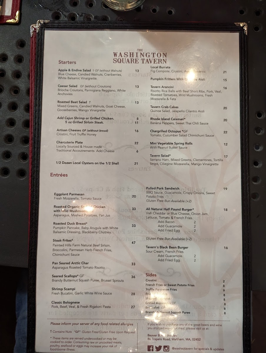 The Washington Square Tavern offers a diverse and satisfying menu that caters to a variety of tastes, from light appetizers to hearty entrées, and even late-night cravings. Starting with the Starters, there are several mouthwatering options like the refreshing Beet Salad, the creamy Burrata, and crispy Calamari. The Cheese Board is a great choice for cheese lovers, while the Kale Caesar provides a vibrant, healthy start to your meal.
